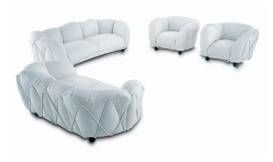 Corbeille by Francesco Binfaré is an invitingly soft sofa, a warm nest to curl up in. The ultimate in relaxation! Its basketshaped woven metal structure is fi lled with soft, informal, loosely covered cushions. The juxtaposition of fabric and leather highlights the contrast between rigid frame and soft, sensual upholstery. (2006)